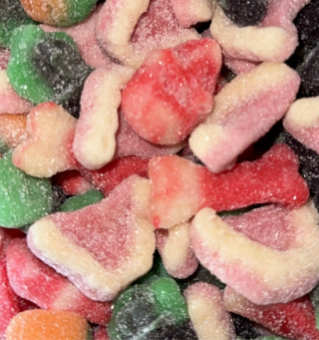 INGRÉDIENTS : Sirop de glucose, sucre, gélatine de bœuf halal, eau, amidon modifié de maïs, amidon de pomme de terre, acidifiants : E270, E330, E296, dextrose, arôme artificiel, agent d'enrobage : monostréarate de glycérol ( tournesol, E471 ), huile végétal ( coco, karité ), colorants : E163, E160a, E129, E133, E100, E102*