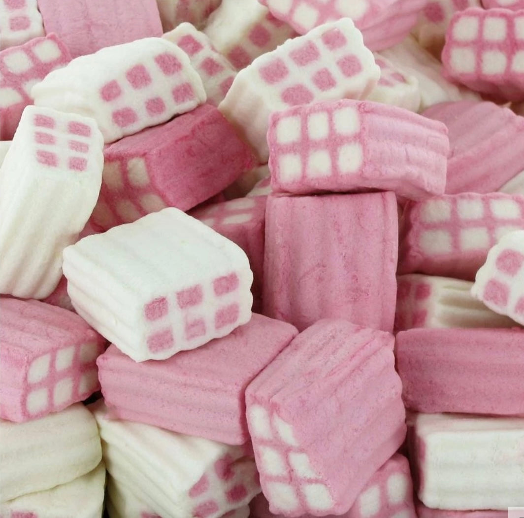 Ces délicieuses confiseries marshmallow en forme de petites briques roses et blanches avec leur texture moelleuse et fondante sont garanties sans gluten et sans matière grasse.. 🩷🤍