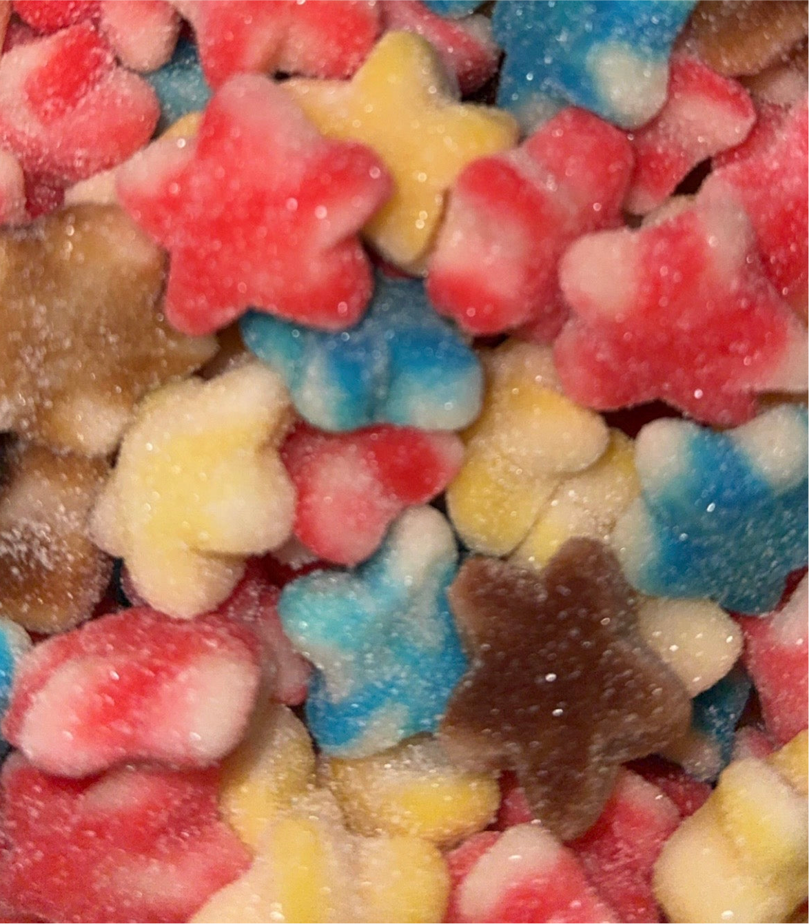 INGRÉDIENTS : Sirop de glucose, sucre, eau, gélatine de boeuf, amidon modifié de pomme de terre, acidifiants : E330, E270, arômes et colorants : E150c, E129*, E100, E133.