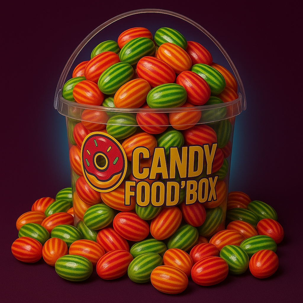 Notre seau XXL de 1kg réunit les iconiques chewing-gums goût melon acidulé et pêche juteuse acidulée, pour une expérience à la fois fruitée, piquante et ultra addictive.
