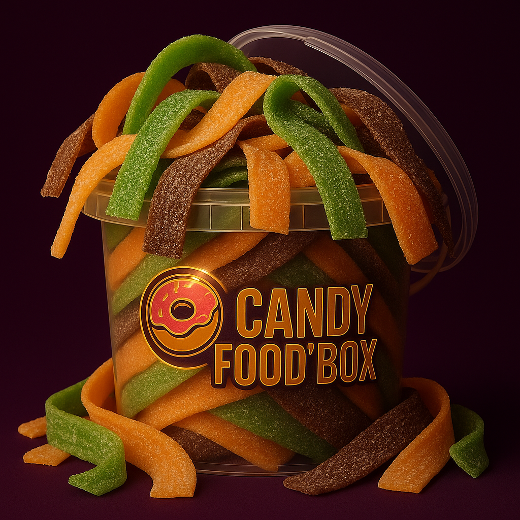 Découvrez notre seau XXL de 1kg rempli de ceintures acidulées aux trois saveurs iconiques : Cola pétillant, Pomme croquante 🍏 et Mangue-Passion exotique 🥭.