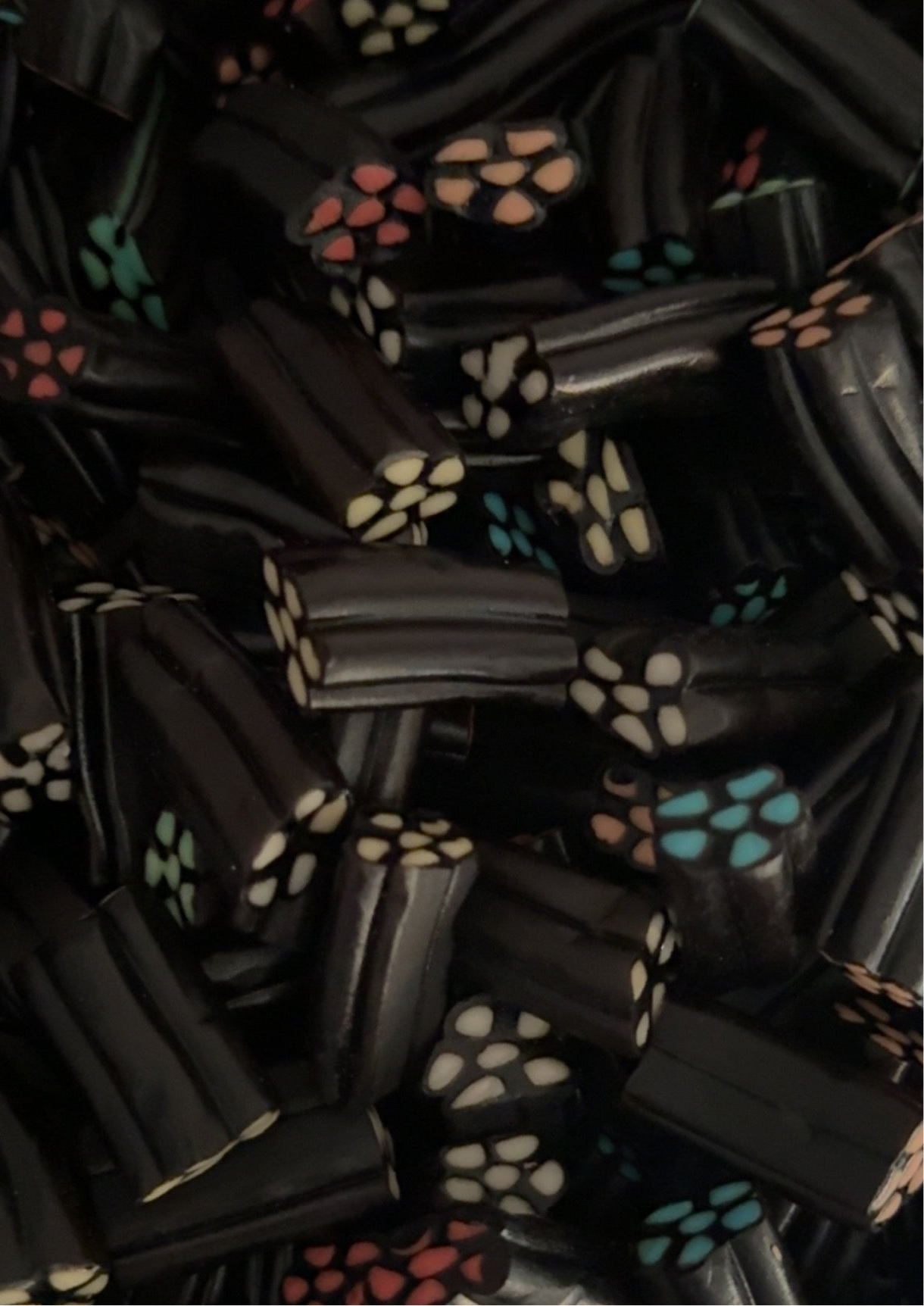 INGRÉDIENTS : Sucre, sirop de glucose-fructose, farine de blé, sirop de sucre inverti, sirop de mélasse, extrait de réglisse, eau, amidon de pomme de terre, graisse végétale (palme), acidifiant E270, amidon modifié de maïs, gélatine, humectant E422, sel, arômes, émulsifiant E471, agent d'enrobage : huile végétale (palme), colorants : E100, E129*, E133, E102. *Le E129 peut avoir des effets négatif sur l'activité et l'attention des enfants.