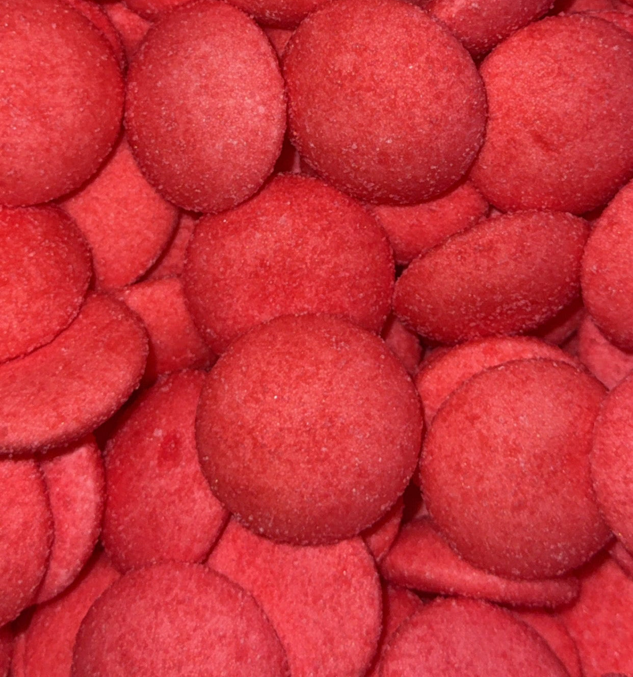 🌿 INGRÉDIENTS : Sucre, sirop de glucose, gélatine, acidifiant (acide citrique), arôme naturel de fraise, colorants (E120), agents d’enrobage (cire de carnauba).