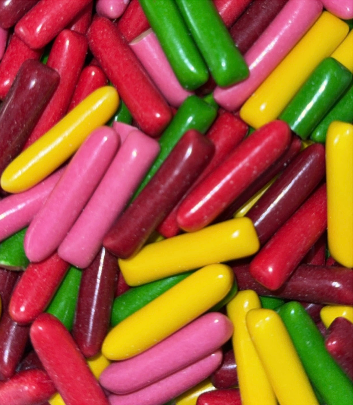 INGRĂDIENTS : Sucre, sirop de glucose, graisse de palme, 5% jus de fruits Ă base de concentrĂ© ( pomme, pĂȘche, citron, fraise, framboise ), gĂ©latine bovine, stabilisant : gomme arabique, amidon modifiĂ©, acidifiants : acide lactique, acide citrique, arĂŽmes, Ă©mulsifiant : lĂ©cithines, colorants : carmins, curcumine, bleu brillant FCF, charbon vĂ©gĂ©tal mĂ©dicinal, agents d'enrobage : cire de carnauba, shellac, cire d'abeille blanche et jaune.