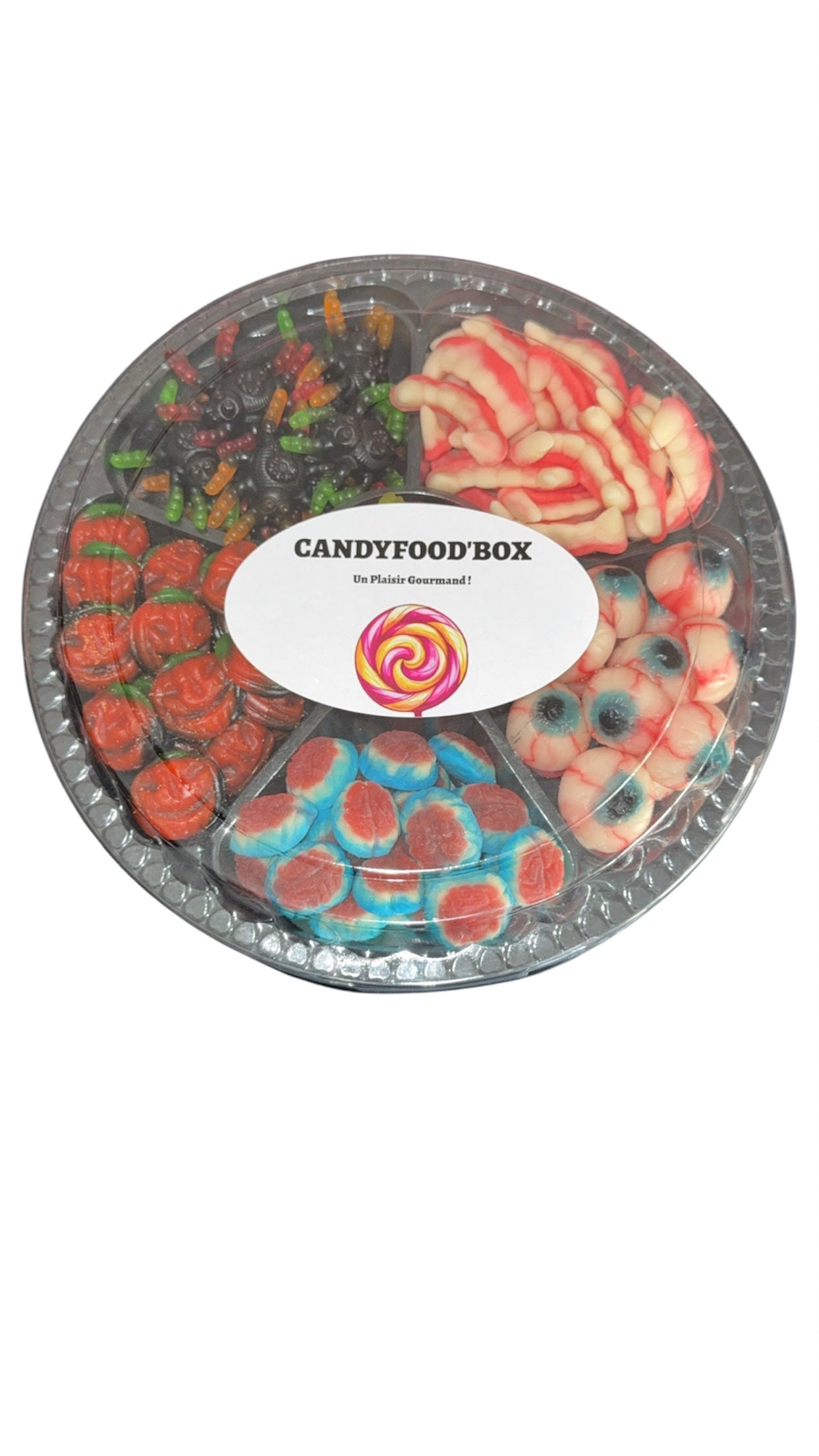 Découvrez notre plateau Halloween 600g, composé de 6 variétés de bonbons monstrueusement gourmands : yeux sanglants, dents de vampire, cerveaux acidulés, araignées gélifiées, vers qui piquent et surprises effrayantes…