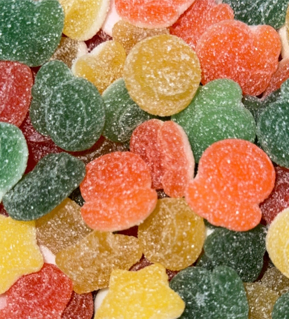 INGRÉDIENTS : Sirop de glucose, sucre, dextrose, gélatine, acidifiant : acide citrique, concentrés de fruits et légumes : carotte, spiruline, pomme, hibiscus, arôme, agents d'enrobage : cire d'abeille blanche et jaune, cire de carnauba.