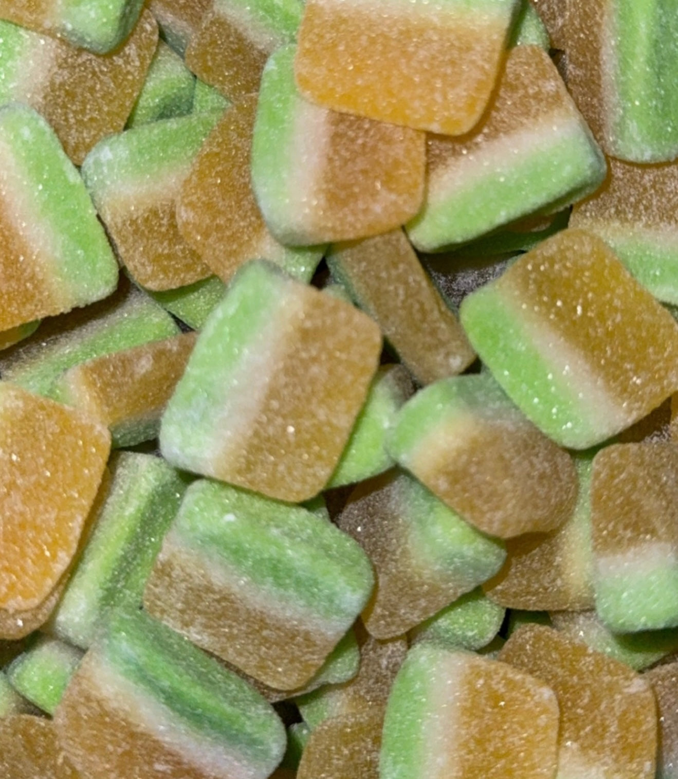 INGRÉDIENTS : Sirop de glucose, sucre, eau, gélatine, acidulants : E330, E296, E270, gélifiant : pectine, arômes, colorants : E102, E150C, E171, agent d'enrobage : huile végétale ( palme ) et cire de carnauba.